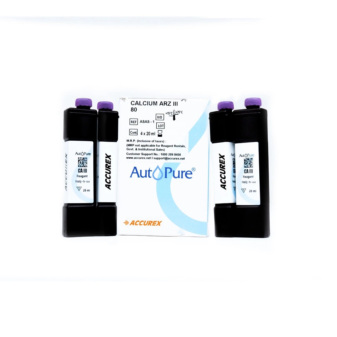 Arsenazo Ill reacts with calcium ions at neutral pH to form a blue coloured complex. Neutral pH Ca **+Arsenazo III – Calcium-arsenazo complex Fully automated systems automatically calculate the Calcium concentration of each sample. Results in mmol/l = Results in mg/dlx0.25 With AutoPure Calcium Arsenazo III, the assay is linear upto 15 mg/dl (3.75 mmol/l). Determine samples with higher concentrations via the rerun function. On instruments without rerun function, manually dilute samples with higher concentrations using 0.9% NaCl or distilled/deionized water (e.g. 1 + 2). Multiply the result by the appropriate dilution factor(e.g. 3).