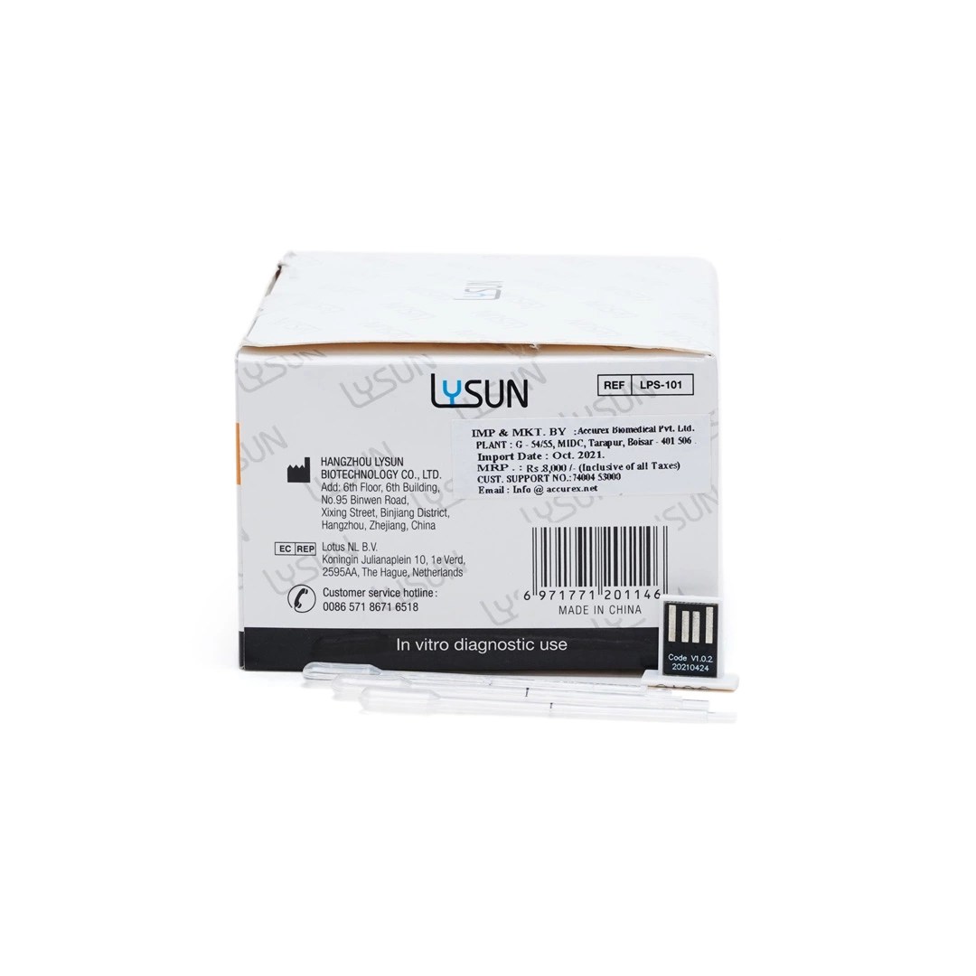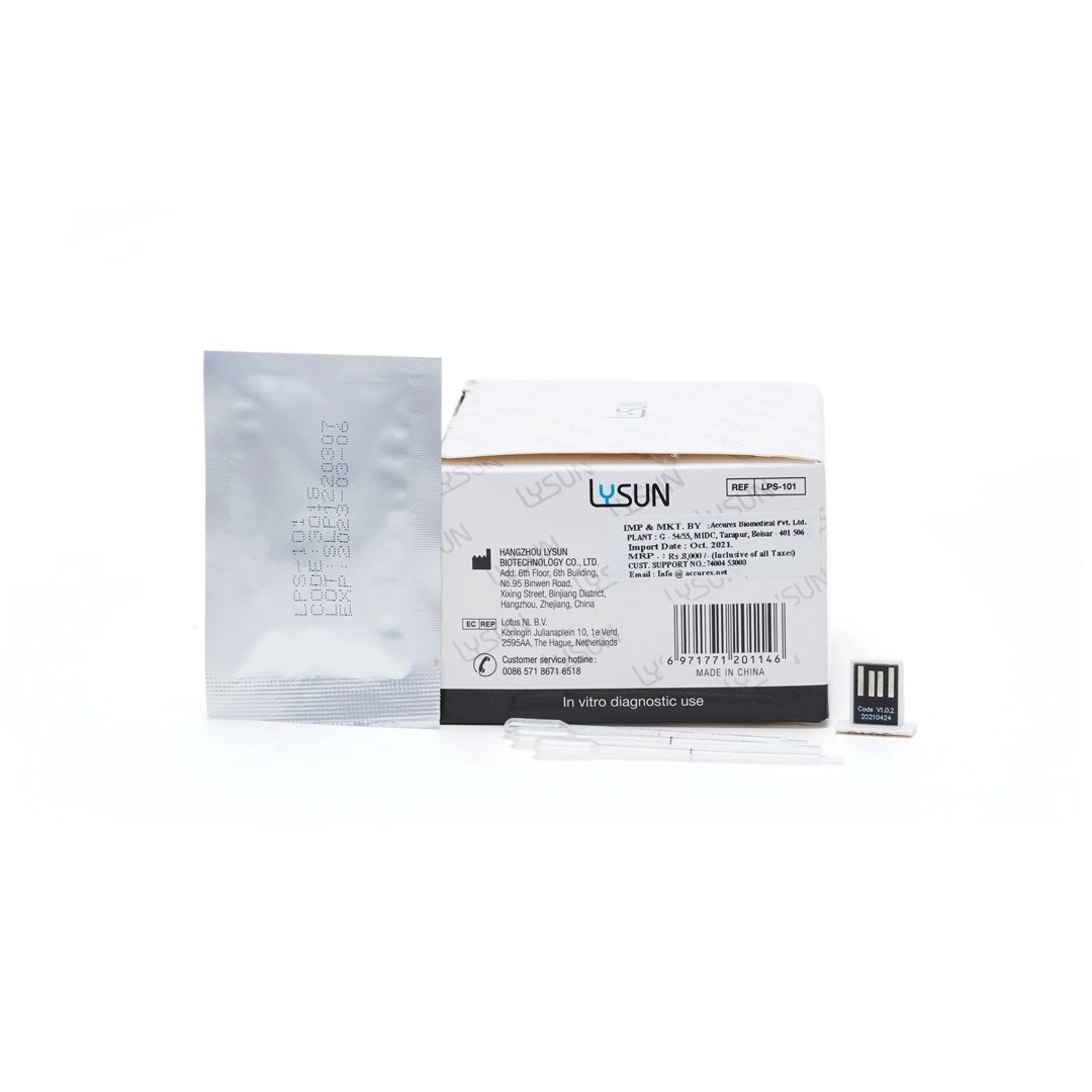 with fresh, capillary (fingerstick) whole blood, or fresh venous whole blood collected in EDTA or heparin tubes. A MEMo Chip® is provided with each package of test strips and must be properly inserted into the analyzer before any test can be run. The MEMo Chip contains the test name, calibration curve, lot number, and test strip expiration date. After the test strip is inserted into the analyzer and blood applied to the test strip, test results are displayed in as little as 90 seconds.